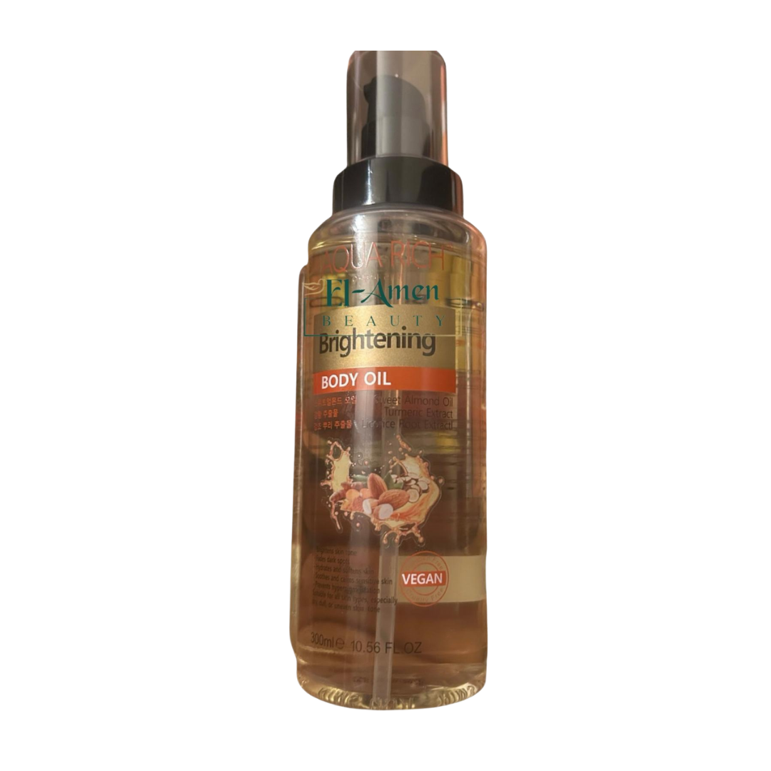Aqua rich brightening body oil infused with sweet almond, turmeric extract, licorice root extract is a brightening body oil, helps to fade dark spot, hydrates and softens ,soothes and calms sensitive skin, prevent hyperpigmentation, suitable for all skin types especially dry, dull, or uneven skin tone.