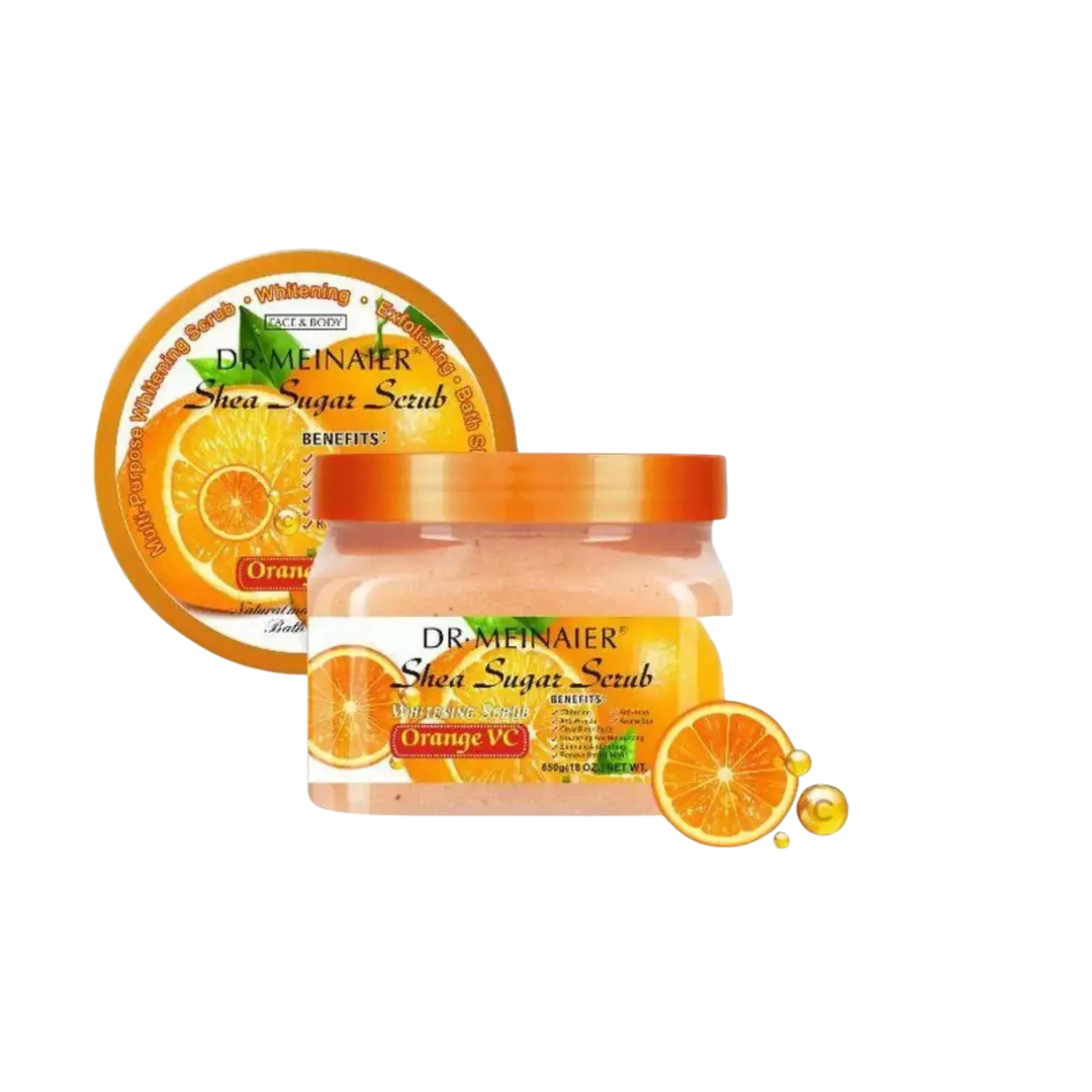Dr Meinaier Shea Sugar Body Scrub with Orange & Vitamin C is an exfoliating scrub for the face and body that is infused with shea butter, vitamin C, and sweet orange oil. It is designed to remove dead skin cells and reveal smoother, brighter skin.