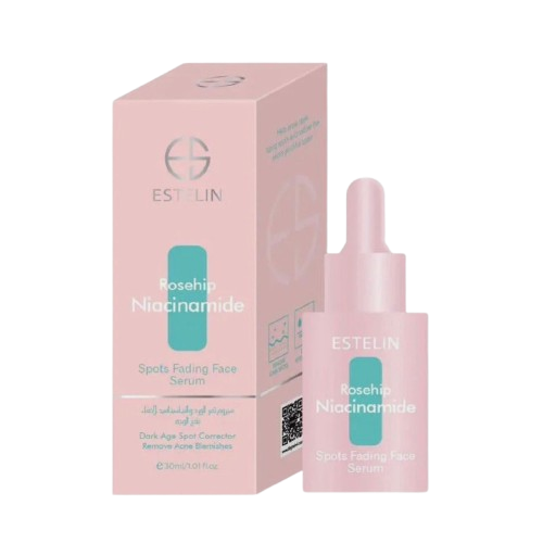 Estelin Rosehip Niacinamide Spots Fading Face Serum (30ml) is a brightening treatment designed to reduce dark spots, acne scars, and sun damage while promoting an even, youthful complexion. It combines niacinamide (Vitamin B3) and rosehip oil to improve skin texture, hydrate deeply, and boost radiance. Suitable for all skin types, it is lightweight, fast-absorbing, and ideal for daily use, acting as a spot corrector.
