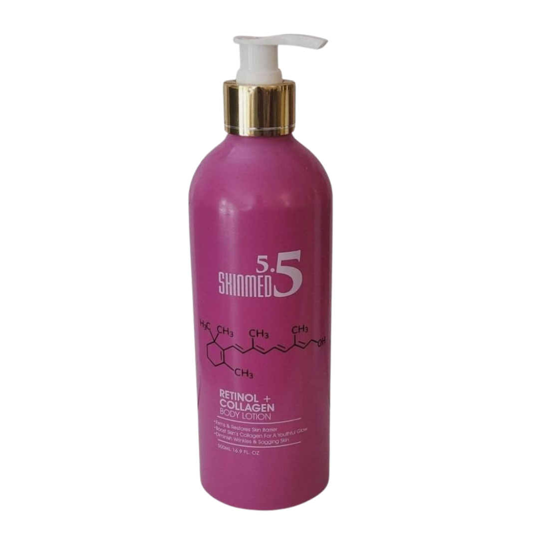 SkinMed5.5 Retinol +  Collagen body lotion  Transform your skincare routine with Skinmed5.5 Retinol and Collagen Body Lotion, a nourishing formula designed to enhance your skin’s appearance and texture. This advanced body moisturizer combines the remarkable benefits of retinol and collagen to help improve skin firmness and maintain hydration throughout the day. The carefully balanced formulation works to support your skin’s natural moisture barrier while delivering intensive hydration to dry, thirsty skin. Perfect for daily use, this body lotion absorbs quickly without leaving any greasy residue, allowing you to dress immediately after application. The lightweight yet effective formula helps to maintain soft, supple skin, making it an excellent addition to your daily skincare regimen. Experience the difference as this luxurious body lotion helps to keep your skin feeling moisturized, smooth, and comfortable.