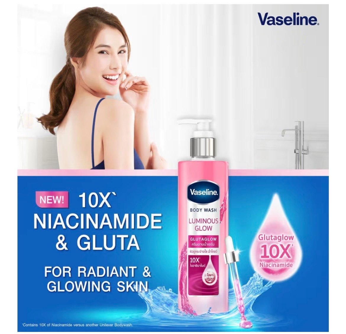 Vaseline Body Wash Luminous Glow Glutaglow GlutaGlowTM Technology with 10X Niacinamide for radiant skin, even skin tone, and a glowing appearance. Enriched with Glutathione for Skin Nourishment. Blended with a sweet and fruity fragrance of freesia blossoms and rose petals, enhanced with freshness by raspberry notes. – Radiant and glowing skin – 10X Niacinamide, Hyaluronic Acid – Hyaluronic Acid helps hydrate and plump the skin. Indulge now lather your body by rubbing before washing off. Vaseline Body Wash Luminous Glow Glutaglow GlutaGlowTM Technology with 10X Niacinamide for radiant skin, even skin tone, and a glowing appearance. Enriched with Glutathione for Skin Nourishment.